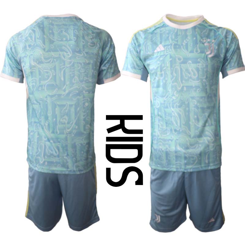 Gostujoči oprema Juventus 2025-2026 je pretežno svetlo modra z belimi logotipi in svetlo limonasto rumenimi detajli.Gostujoči dres Juventus 25-26 ima več kapljični vzorec s kvadratnimi detajli v obliki okvirja, ki ga je navdihnilo italijansko poletje.