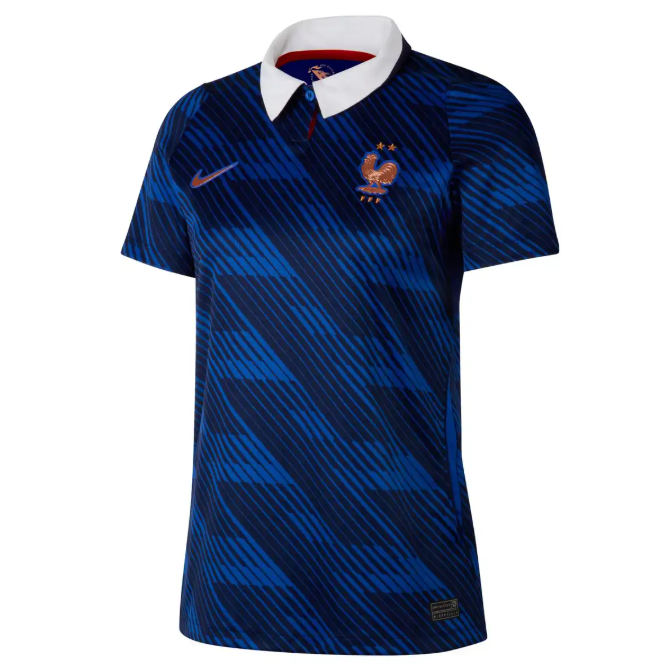 Ženski Nogometni dresi Francija reprezentance za svetovno prvenstvo 2026 ima kraljevsko modro podlago z zlatim grbom ekipe ter črno-zlatimi poudarki. Ključni elementi oblikovanja so jasno vidni na rokavih, ki vključujejo tudi črno-zlate obloge.